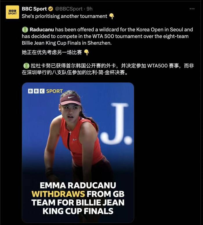 与此同时,前美网冠军艾玛·拉杜卡努因退出比利·简·金杯预选赛的决定引发了争议。值得一提的是,这已是拉杜卡努2025年第二次退出国家队赛事,她曾在今年4月份以需要“照顾身体”为由退出预选赛。